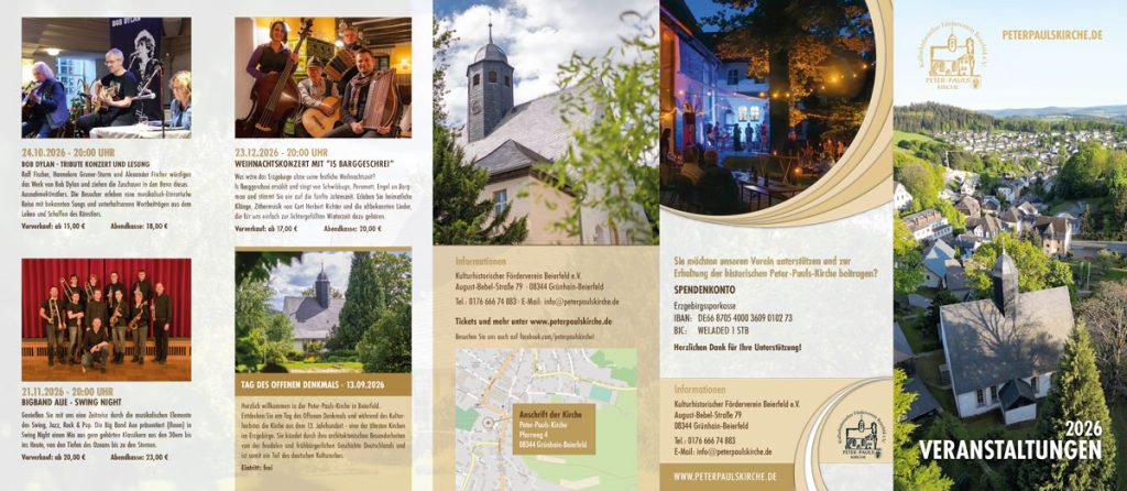 Ein aufregendes Jahr liegt vor uns und wir freuen uns sehr, ein buntes, abwechslungsreiches und generationsübergreifendes Veranstaltungsprogramm anbieten zu können. Freuen Sie sich auf Ihren Besuch in einer der ältesten Kirchen im Erzgebirge.